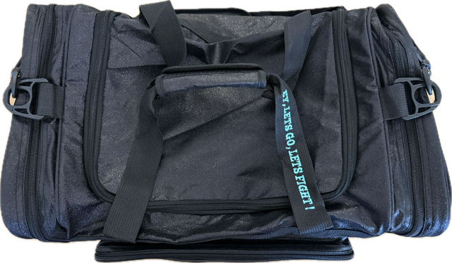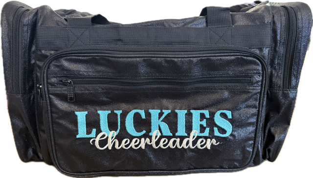 Sportasche LCDC bestickt an der Frontseite mit Luckies Cheerleader. Weiterhin bestickt mit Schriftzug EY, Lets Go, Lets Fight am Vorderen Trageriemen. Die gesamte Sporttasche glitzert und hat die Maße: